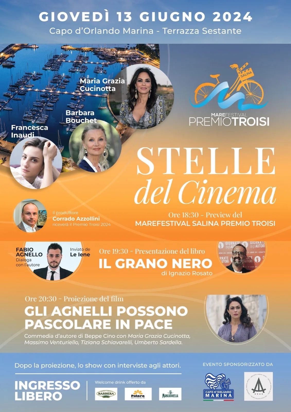 Le stelle del Cinema approdano al Marina di Capo d’Orlando che quest’anno ospiterà la serata anteprima della XIII edizione del Marefestival Salina Premio Troisi (14/16 giugno sull’isola eoliana): appuntamento giovedì 13 giugno alle ore 18.30 nella sala meeting del Sestante Marina Motel, all’interno del porto, per la conferenza stampa d’apertura, alla presenza del presidente del CdA, l’architetto Giuseppe Mangano, della madrina Maria Grazia Cucinotta, delle attrici Barbara Bouchet e Francesca Inaudi, del produttore Corrado Azzollini, Premi Troisi 2024, del direttore artistico, il giornalista Massimiliano Cavaleri e della conduttrice, la giornalista Nadia La Malfa.