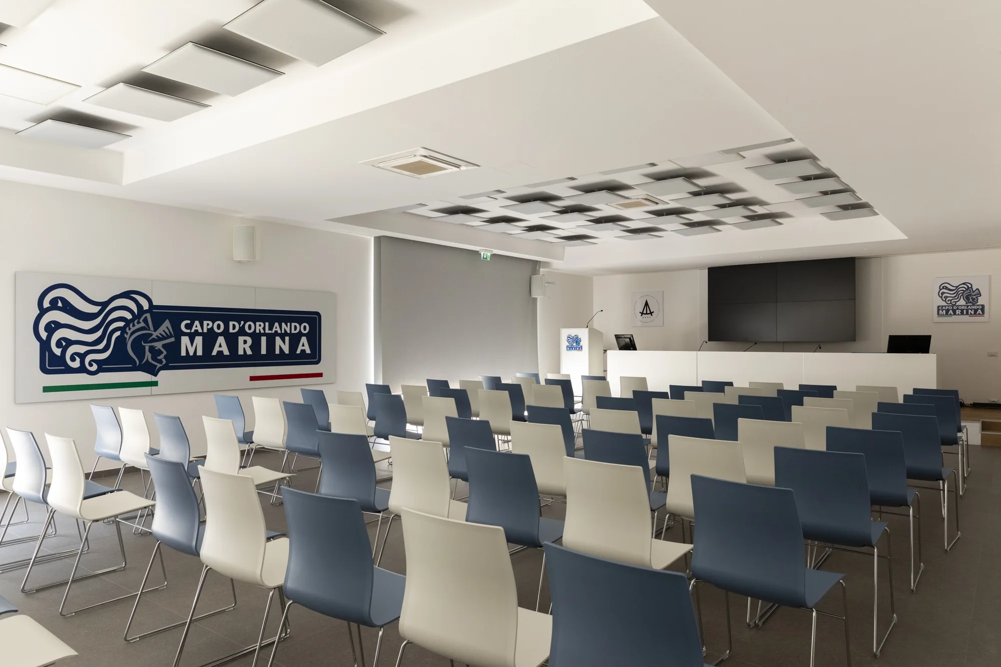 La struttura dispone di una sala meeting con capienza fino a 100 posti, una lounge riservata per incontri privati e la Terrazza Mercadante, sala ricevimenti sotto la caratteristica cupola blu, capace di ospitare fino a 350 persone. Qui si svolgono eventi, ricevimenti e momenti istituzionali, impreziositi dalla cornice architettonica del marina e dal legame profondo con il mare.
