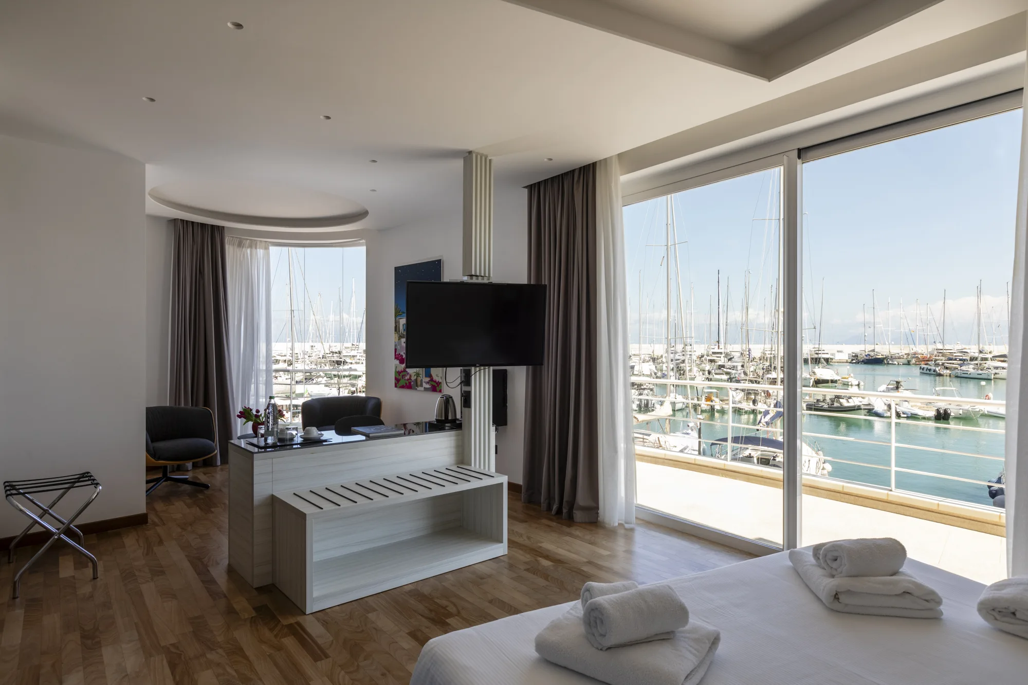 Dispone di 13 camere, tra Suite, Junior Suite e camere con vista sul porto o sulla corte interna, arredate con linee essenziali e materiali naturali.